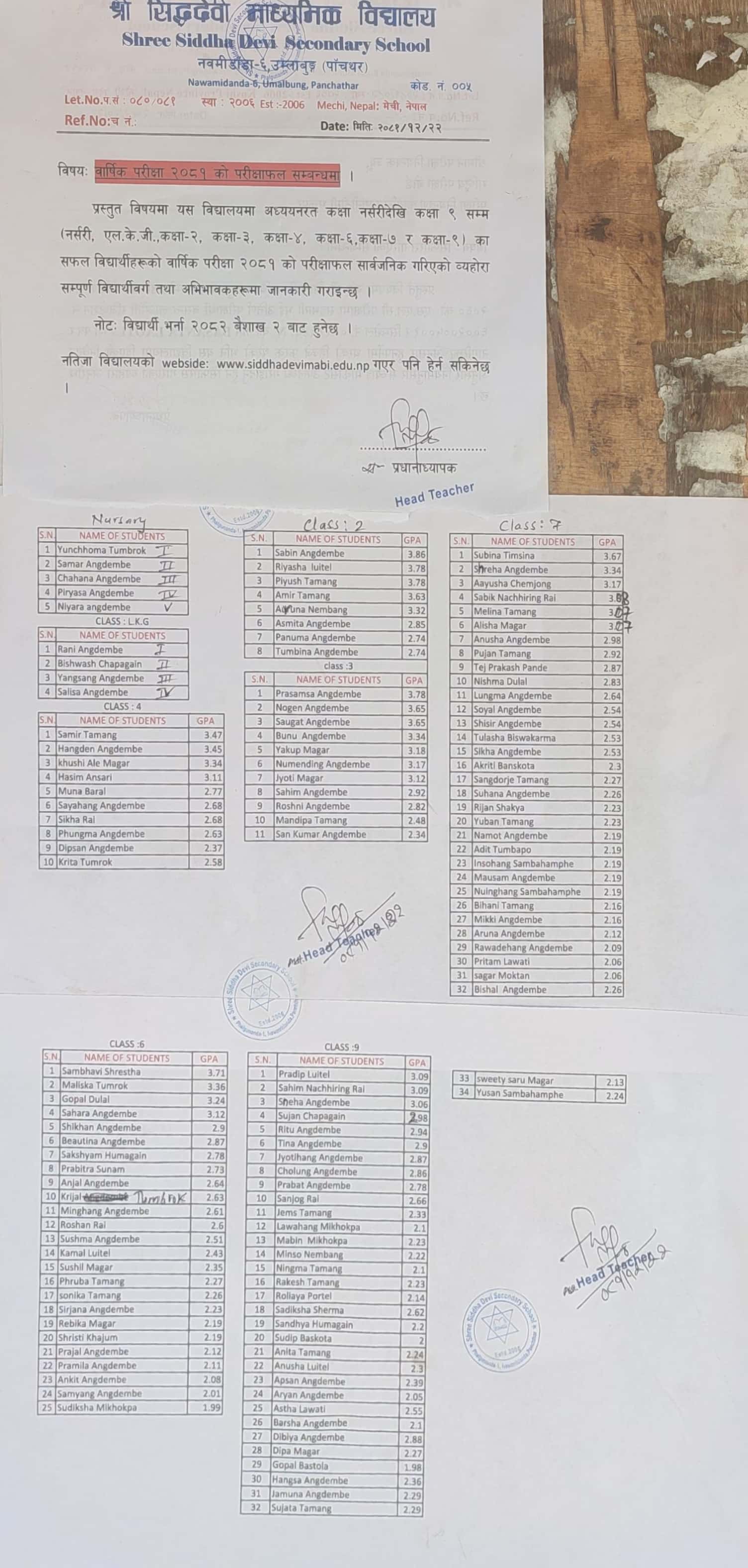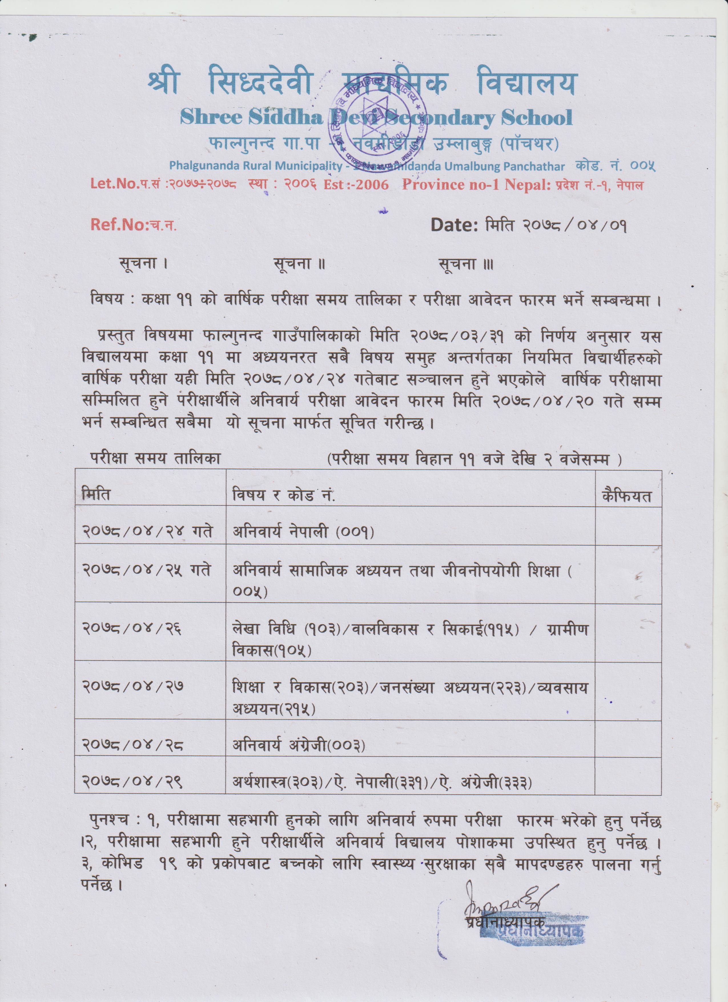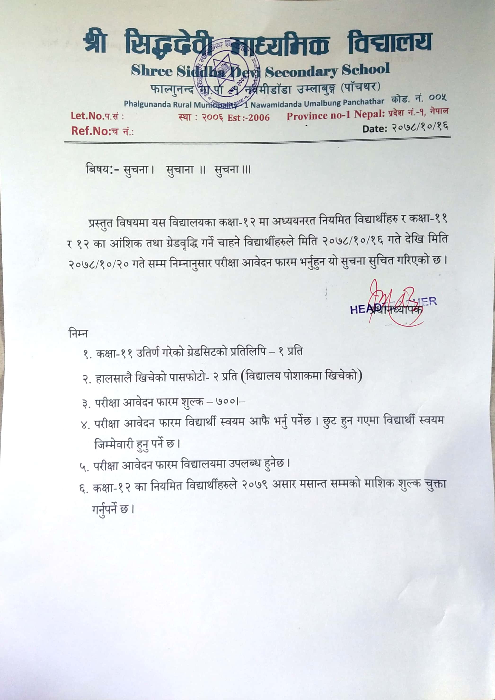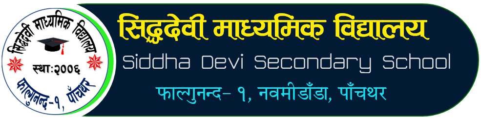 विद्यालयको संक्षिप्त परिचय पाँचथर जिल्ला प्रदेश नं १ प्रदेश सभा निर्वाचन क्षेत्र ९ख० को फाल्गुनन्द गाउँपालिका वडा नं १ मा अवस्थित श्री सिद्धदेवी माद्यमिक विद्यालय वि। सं २००६ सालमा स्वर्गीय लिलाराज आडदेम्बेको नेतृत्वमा स्थापना भयो । सदरमुकाम फिदिमबाट १९ कि। मि। दक्षिणमा सिवा, लुम्फाबुङ, ईम्बुङको केन्द्रमा रहेको यो विद्यालय वि। सं २०१३ सालमा धनकुटा गैंडाबाट नि ।मा। वि। सञ्चालन गर्ने अनुमति प्राप्त यस विद्यालयले वि।स। २०४० सालमा स्थानिय जनताको सहयोगमा तत्कालिन गाउँपञ्चायतका प्रधानपञ्च श्री घनेन्द्र राज आङदेम्वे ज्युको नेतृत्वमा क्षेत्रीय शिक्षा निर्देशनालय , पूर्वाञ्चल शाखा, धनकुटाबाट माद्यमिक तहको अनुमति प्राप्त गर्यो। । देशमा आएको राजनैतिक परीवर्तन संगसगै शिक्षामा पनि परीवर्तनको संकेत देखा पर्यो। जसको परीणाम स्वरुप २४ वर्ष पछि यस विद्यालयले शिक्षक तथा कर्मचारी, स्थानिय जनता र नवमीडाँडा गा।वि।स।को आर्थिक सहयोगमा तत्कालिन विद्यालय व्यवस्थापन समितिका अध्यक्ष श्री देव कुमार सोम्वाहाम्फे र प्रधानाध्यापक श्री वीरेन्द्र कुमार खड्काको नेतृत्वमा वि।स। २०६५ सालमा उच्च माद्यमिक शिक्षा परीषद्, सानोठीमी, भक्तपुरबाट ं२ सञ्चालन अनुमति प्राप्त गरी हाल वालविकास देखि कक्षा १२ सम्म तीनओटा संकाय शिक्षा,मानविकी र व्यवस्थापन अध्ययन अध्यापन भइरहेको छ । श्री सिद्ध देवी मा।वि। को सेवा क्षेत्र विस्तृत रहेता पनि यहाँ अधिकाँश जनजातिहरुको वसोवास रहेको छ ।जसमा लिम्बु जाति लगभग ७०प्रतिशत ,तामाङ १० प्रतिशत, मगर ६ प्रतिशत,राइ २प्रतिशत ,नेवार १प्रतिशत र अन्य ११ प्रतिशतको हाराहारीमा बासिन्दा रहेका छन् ।विशेष गरेर यहाँका मानिसहरु शिक्षाअर्जन भन्दा वैदेशिक रोजगारीमा बढी आकर्षित भएको पाइन्छ ।तसर्थ शिक्षा प्रति आकर्षण गर्नको लागि समय सापेक्ष विकास भएका शिक्षण विधि र प्रविधि साथै भरपर्दो सञ्चार माध्यमको उपयोग गर्नु युगानुकुल आवश्यक्ता महशुस भएको छ ।नेपाल सरकारद्वारा वि।स।२०७६मा नमुना विद्यालय विकासको छनोट सूचिमा सूचिकृत भए पश्चात सामाजिक विकास मन्त्रालय प्रदेश न।१ बाट आइ।सि।टी।व्यवस्थापनको लागि हालसम्म रु।११,५०,००० । , राष्ट्रपति शैक्षिक सुधार कार्यक्रम आ।व।२०७७र२०७८ मा प्रविधि मैत्री शिक्षणको लागि रु ६,५०,०००। र फाल्गुनन्द गाउँपालिका फाक्तेप ,पाँचथरबाट दुइकोठे पक्की विज्ञान प्रयोगशाला भवन निर्माणका लागि रु १६,००००० । प्राप्त भइ सोही अनुरुपको व्यवस्थापन भइरहेको छ ।नमुना विद्यालय विकास आन्तर्गत वर्तमान अवस्थामा भौतिक विकासलाइ प्राथमिकता दिइएको छ ।विद्यालयको शैक्षिक, भौतिक,अर्थिक विकासका लागि यस विद्यालयका शिक्षक तथा कर्मचारी, वि।